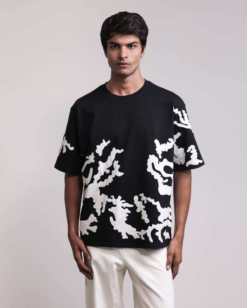 Crafted from 100% cotton in a durable 240 GSM single jersey, this hand-embroidered T-shirt blends comfort with artistry. Featuring contrast hand-appliqued camouflage pattern, it’s designed with relaxed shoulders for a relaxed fit.